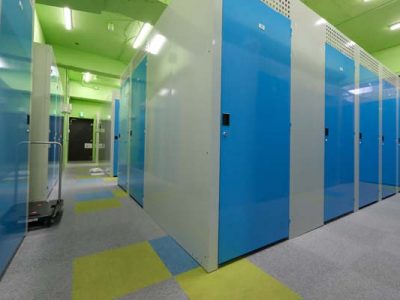 カビ対策として除湿機の設置。契約者のみ入退室できるようセコムのセキュリティシステムを導入。室内は屋内型トランクルームならではの明るくキレイな室内です。